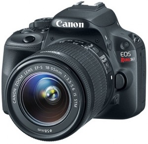 Canon EOS 100D / EOS Rebel SL1 which is called the “the smallest and lightest APS-C DSLR ever made.” Measuring just 116.8 x 90.7 x 69.4mm and weighing only 407g, the EOS 100D features a 3” ClearView II capacitive touchscreen, an 18-megapixel Hybrid CMOS AF II sensor and DIGIC 5 processor.
