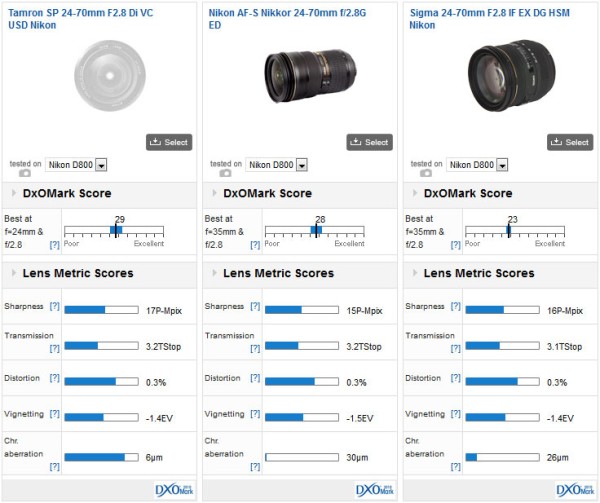 Nikon D800 is used for the tests and Tamron pushed the Nikon 24-70mm f/2.8G into second place as the Nikon lens had a score of 28. The Sigma 24-70mm f/2.8 IF EX DG HSM lens also compared and got a score of 23.
