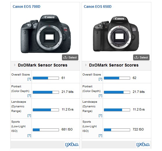 According to the DxOMark tests, Canon EOS 700D vs. EOS 650D also shows no significant improvement over its predecessor. Like its predecessor, the new Canon EOS 700D DSLR camera has an 18MP APS-C Hybrid CMOS sensor with built-in phase-detection autofocus, a DIGIC 5 processor, a 9-point cross-type AF system, and Full HD movie mode.