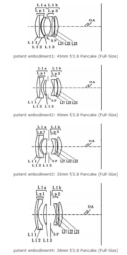 Below are the patent details of the 45mm f/2.8, 40mm f/2.8, 35mm f/2.8, 28mm f/2.8 pancake lenses.