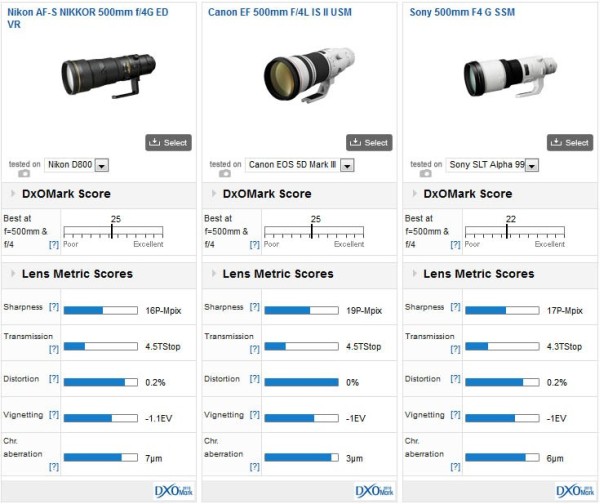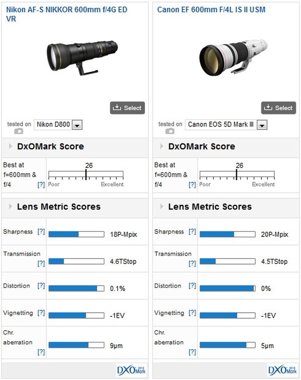 The AF-S NIKKOR 500mm f/4G lens scored 25 while the AF-S Nikkor 600mm f/4G lens scored 26 from DxOMark test results. NIKKOR 500mm f/4G lens currently priced $8,399.00 and the Nikkor 600mm f/4G lens price is $9,799.00.