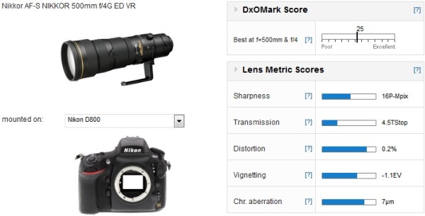 Nikon’s telephoto lens 500mm f/4G lens scored 25 mounted on D800, test results are below.