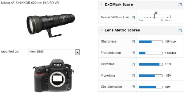 Nikon’s telephoto lens 600mm f/4G lens scored 26 mounted on D800, test results are below.