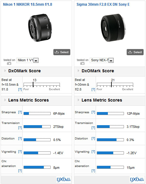 Below are the current Nikkor 1 mirrorless lenses according to DxOMark test results. Also comparison with other mirrorless lenses.