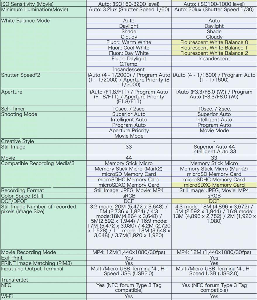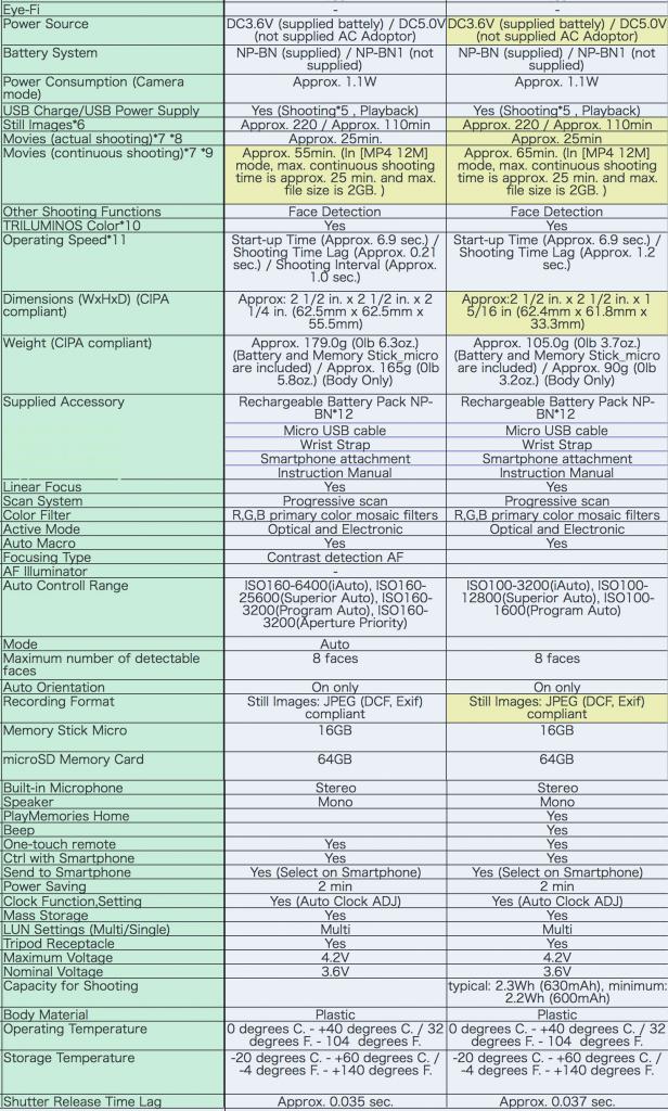 Sony QX100 and QX10 Specs List