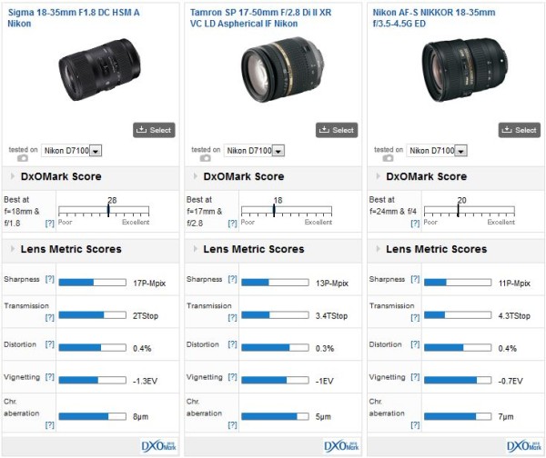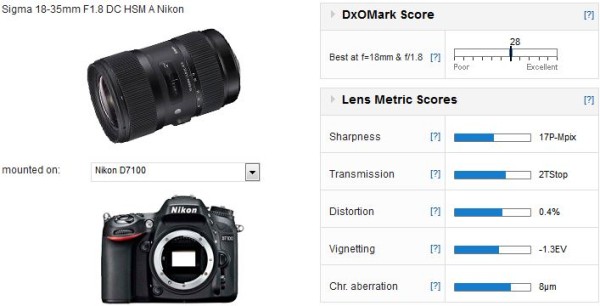 DxOMark published their test results for the Sigma 18-35mm f/1.8 DC HSM lens which is currently priced for $799. Sigma 18-35mm f/1.8 DC HSM lens scored 28 which is the highest score in the DxOMark zoom lenses database. DxOMark tested this lens with the mid-level Nikon D7100 DSLR camera.