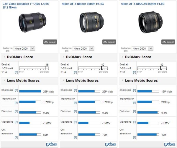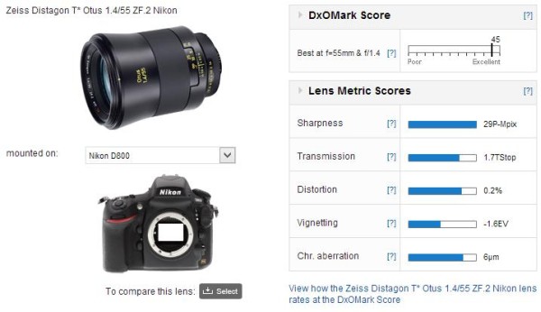 DxOMark has posted their test results for the new Zeiss Otus 55mm f/1.4 Distagon T* lens. They have tested the new Zeiss Otus 1.4/55 lens for Nikon mount and the lens scored a point of 45.5. The score is higher than the AF-S NIKKOR 85mm f/1.4G lens which is currently the best lens in the DxOMark database.