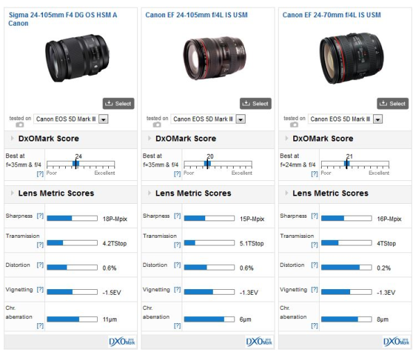 DxOMark published their test results for the Sigma 24-105mm f/4 DG OS HSM lens which is currently priced for $899. Sigma 24-105mm f/4 DG OS HSM lens scored 24, and has a very high sharpness score of 18P-Mpix, one of the sharpest in the professional zoom category. DxOMark tested this lens with the high-end Canon EOS 5D Mark III DSLR camera.