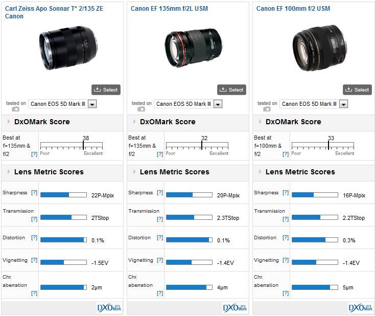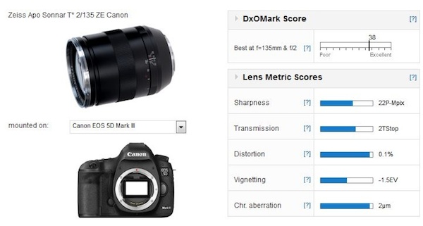 Zeiss Apo Sonnar T* 2/135 ZE lens scored 38 point and placed in the first place in DxOMark rankings of fixed focal length telephoto lenses in their database. The lens was tested with the Canon EOS 5D Mark III DSLR camera.