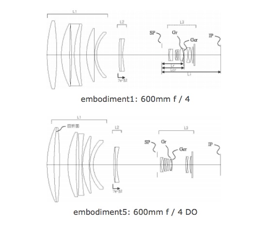 Egami discovered a new patent filed by Canon in Japan. The new patent describes a Canon EF 600mm f/4 telephoto prime lens. Canon currently has the EF 600mm f/4 IS II USM telephoto prime lens in the lineup. The 600mm f/4 IS II lens introduced in 2010-2011.