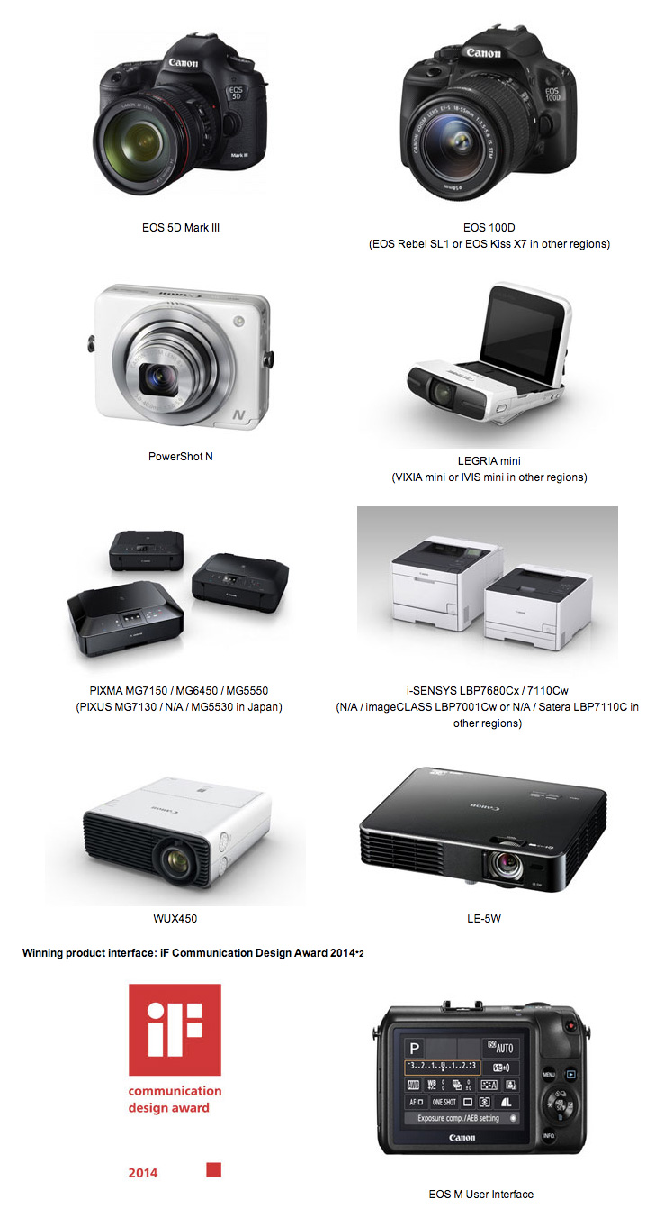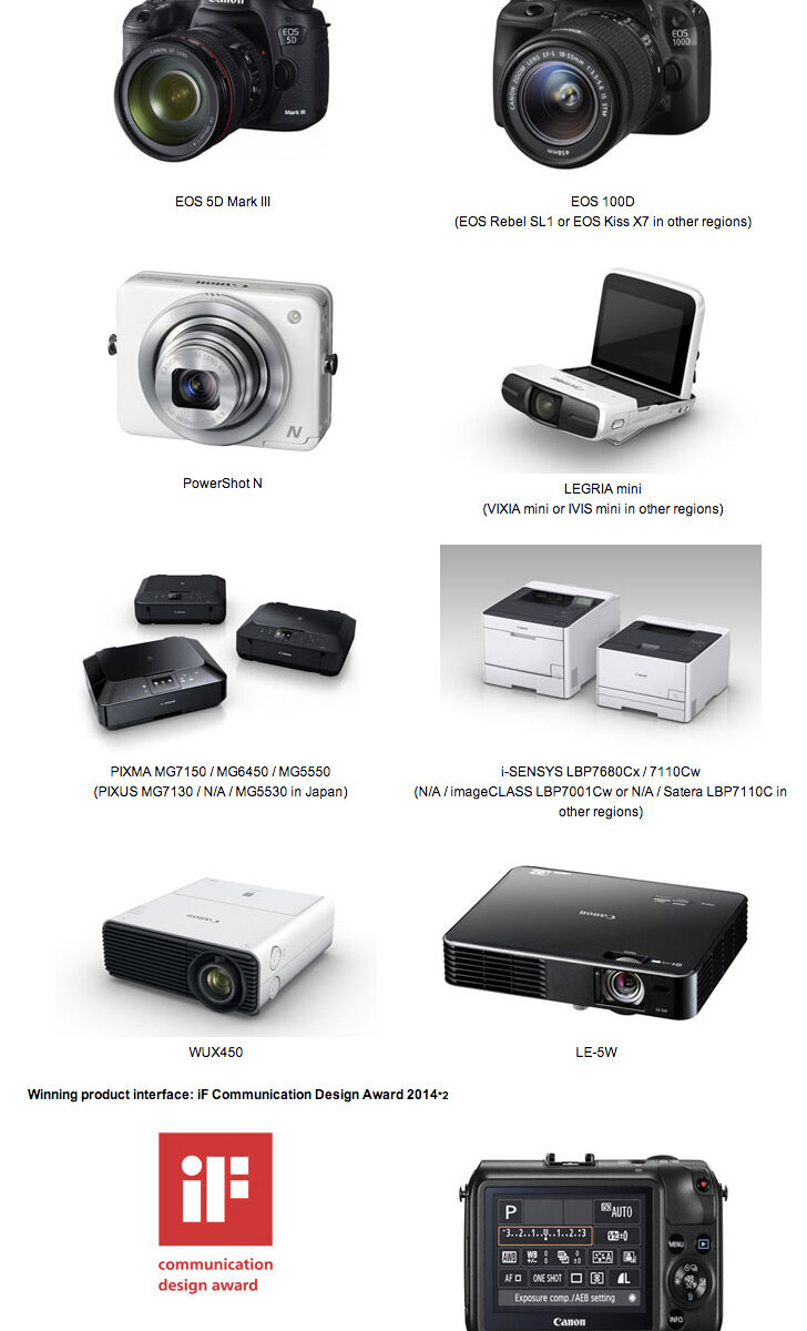 iF Product Design Awards went to the EOS 5D Mark III and EOS 100D (EOS Rebel SL1 or EOS Kiss X7 in other regions) digital SLR cameras, the PowerShot N compact digital camera, the LEGRIA mini (VIXIA mini or IVIS mini) camcorder, the PIXMA MG7150 / MG6450 / MG5550 (PIXUS MG7130 / N/A / MG5530 in Japan) inkjet printers, the i-SENSYS LBP7680Cx / 7110Cw (N/A / imageCLASS LBP7001Cw or N/A / Satera LBP7110C) color laser beam printers, the WUX450 multimedia projector, and the LE-5W LED projector. The iF Communication Design Award went to the user interface for the EOS M compact-system camera.