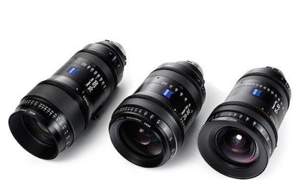 The new Compact Zoom CZ.2 15-30mm T2.9 (far right) next to Zeiss’ CZ.2 28-80mm T2.9 and CZ.2 70-200mm T2.9 lenses.