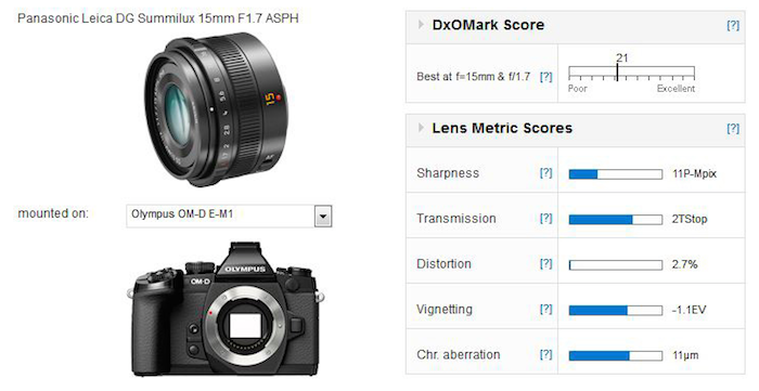 Panasonic Leica DG Summilux 15mm f/1.7 lens scored 21 points and this is a overall good score with very good transmission and high peak sharpness. The new Panasonic Leica 15mm f1.7 tested with the Olympus OM-D E-M1 micro four thirds shooter.