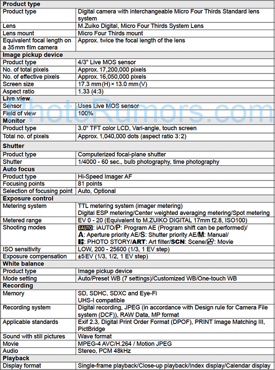 Olympus PEN E-PL7 specs list include a 3-inch 1,040K-dot articulated LCD touchscreen, shutter speed between 1/4000th and 60 seconds, AF system will provide 81 points and ISO range will be between 200 and 25,600.