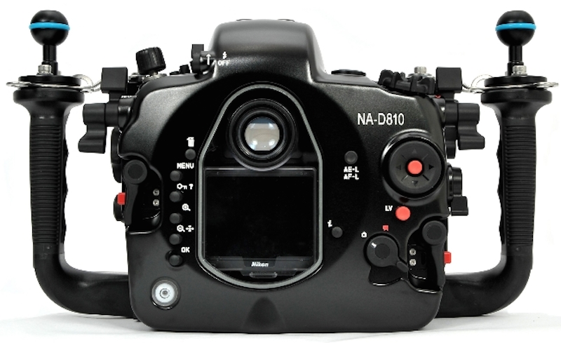 Dual thumb levers, located on the right and left sides of NA-D810 pull important camera functionality from the back of the housing out to the handles. This allows quick access to Video Record, AF-ON (for thumb activated focus), ISO and Image Playback. Complete control of the camera is available from the ergonomic rubberized handles.