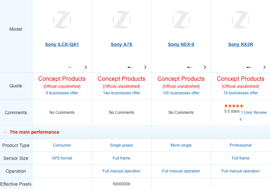 The listing on Chinese website, Zol.com (translated version) also includes the Sony ILCE-QX1 which is currently filed for a “Certificate of Compliance” in Russia and described as “interchangeable lens digital camera”.