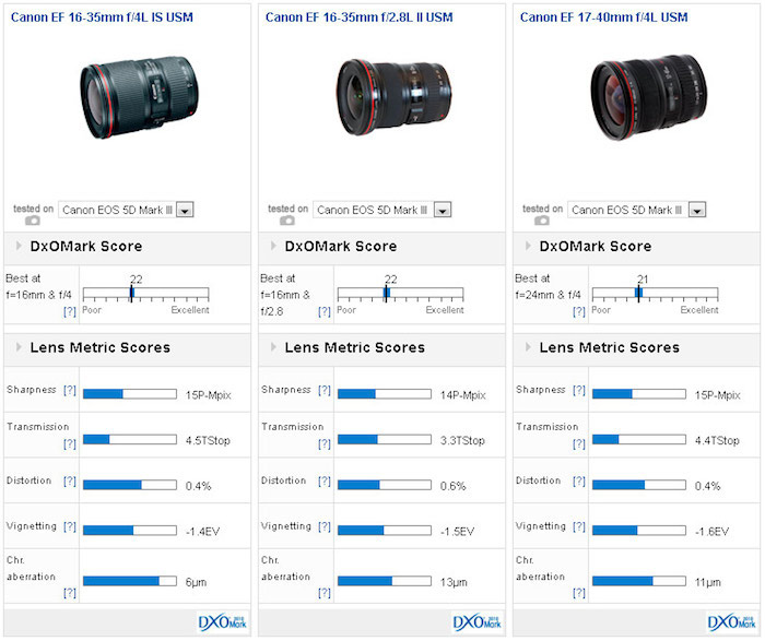 The Canon EF 16-35mm f/4L IS USM lens achieves a high ranking for an ultra-wide angle lens with DxOMark score of 22 points. The lens produce high image performance and tested with the Canon EOS 5D Mark III DSLR camera.