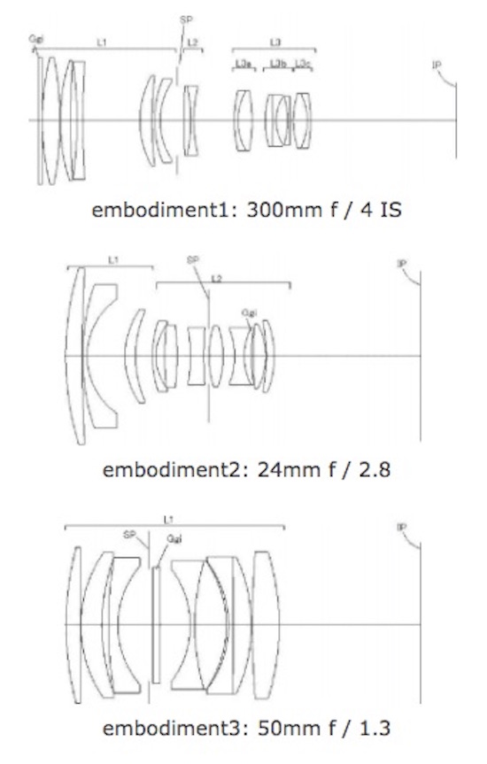 Canon has filed a new patent in Japan for the the 300mm f/4 IS, 24mm f/2.8, and 50mm f/1.3 lenses.