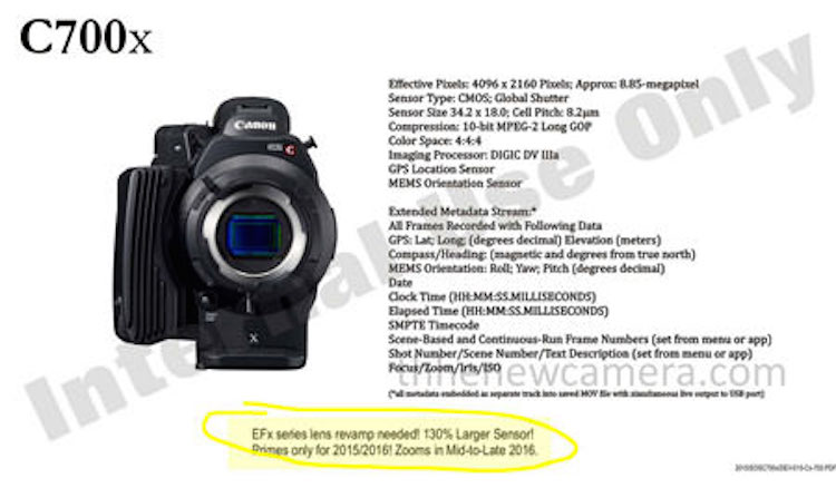 First image and specs of the Canon EOS C700x camera have been leaked online. From the image we can say the Cinema EOS camera will come with a global shutter and capable of recording videos at 4K resolution.