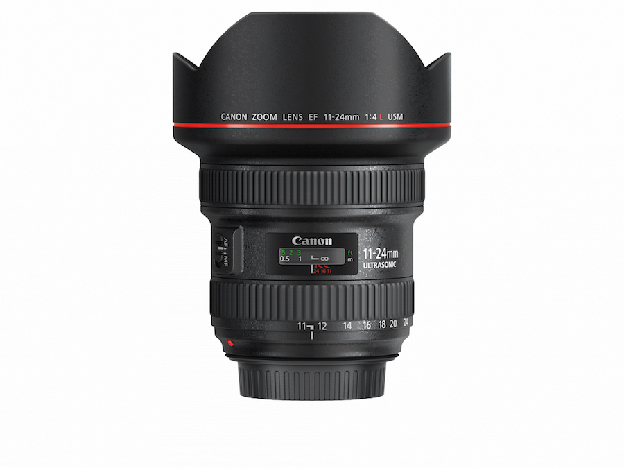 The EF 11-24mm f/4L lens offers the widest angle of view ever provided in a rectilinear full-frame DSLR lens, and uses 16 elements in 11 groups with a total of four aspherical elements for distortion control.