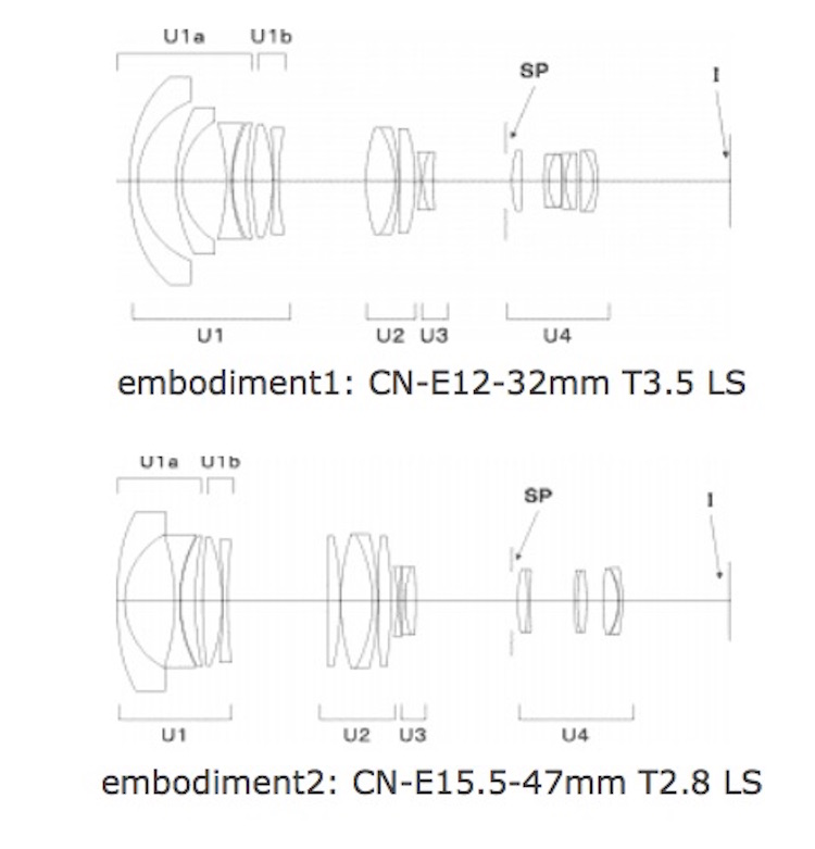 Canon has filed a new patent in Japan for two Cinema lenses. The patent describes the 12-32mm T3.5 and 15-47mm T2.8 lenses designed for the EOS Cinema cameras.