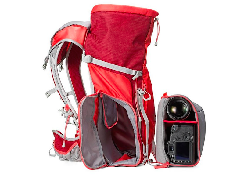 Half of the space is dedicated to personal objects needed for an outdoor trip, and the other half features a removable camera case that can carry a Pro DSLR, 70-200mm lens plus an additional lens. The camera case features the Manfrotto Protection System which is specifically designed to ensure maximum protection, and once this is removed the backpack can be turned into a total hiking bag.