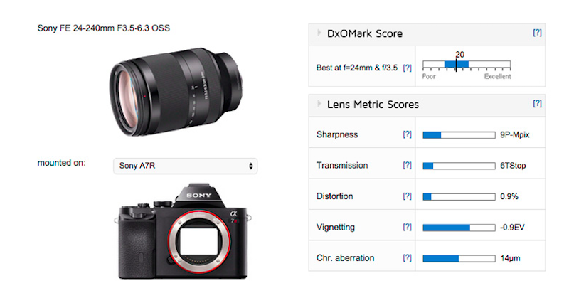Sony FE 24-240mm f/3.5-6.3 OSS lens test results shows the lens score of 20 points. The lens ranks fairly low down in the overall rankings in DxOMark lens database. The FE 24-240mm f/3.5-6.3 OSS has the lowest score for all FE-mount optics mounted on the Sony A7R and ninth for all FE-mount lenses tested so far.