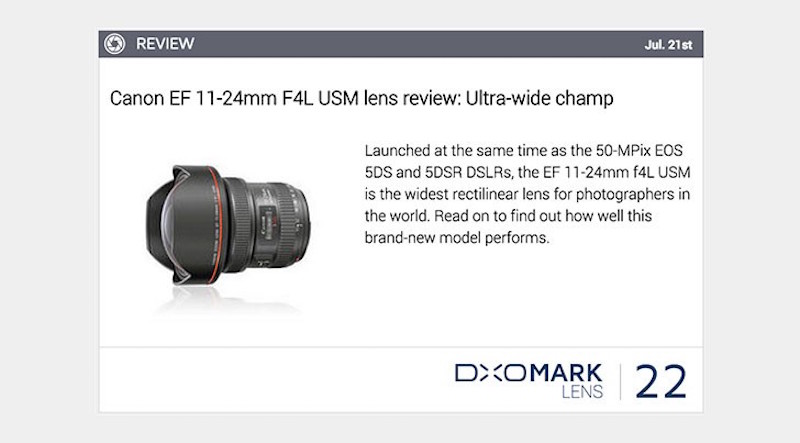 DxOMark published their test results for the Canon EF 11-24mm f/4L USM wide-angle zoom lens which is currently priced for $2999.00 at Amazon.