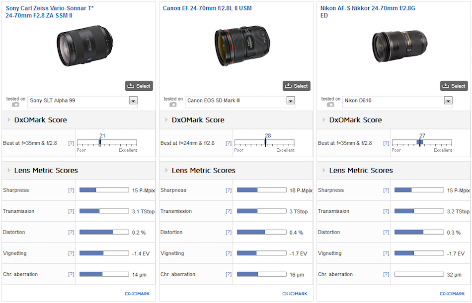 Sony Zeiss Vario-Sonnar T* 24-70mm f2.8 ZA SSM II vs. Canon EF 24-70mm f2.8L II USM vs. Nikon AF-S Nikkor 24-70mm f2.8G