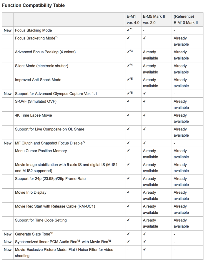 Along with this latest firmware upgrade, latest firmware for the M.Zuiko Pro and Premium lenses will also be released. Aperture drive has been improved for smooth exposure control even when shooting movies in situations with sudden changes in brightness. It also supports for disabling the MF Clutch and Snapshot Focus.
