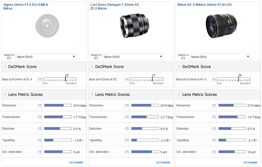 Sigma 24mm f/1.4 DG HSM Art lens test results shows the lens score of 38 points and earned a high score overall. The wide-angle lens tested by using the Nikon D810 digital SLR camera.