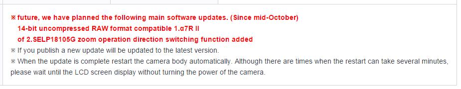 The company previously announced their plans to add user selectable compressed or uncompressed 14-Bit RAW still image capture via firmware update to additional cameras beginning with the recently introduced α7R II full-frame mirrorless model.