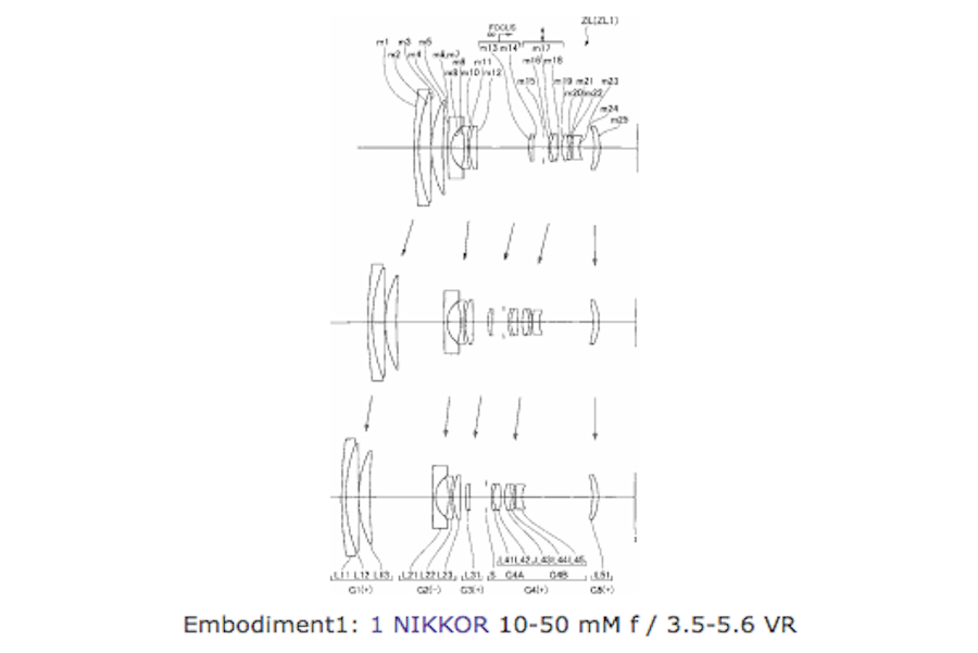 The new patent describes Nikon 10-50mm f/3.5-5.6 VR lens designed for mirrorless cameras with 1-inch-type sensors.