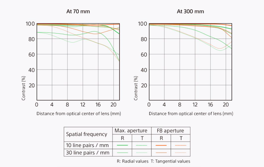 Additional coverage of the Sony FE 70-300mm f/4.5-5.6 G OSS lens includes sample images, MTF chart and size comparison with the 70-200mm F2.8 GM and 70-200mm F4 G OSS lenses.