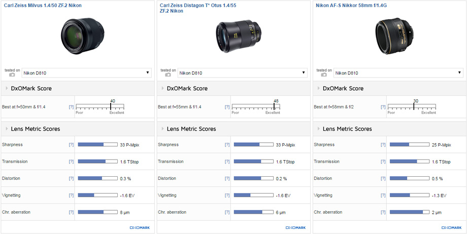 Zeiss Milvus 1.4/50 ZF.2 Nikon vs. Zeiss Distagon T* Otus 1.4/55 ZF.2 Nikon vs. Nikon AF-S Nikkor 58mm f/1.4G