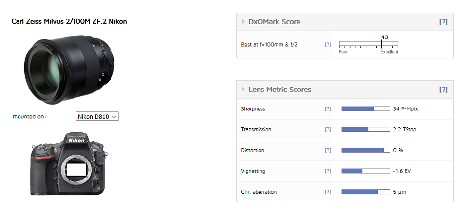 Zeiss Milvus 100mm f/2 Macro lens test results published by DxOMark. Tested on the Nikon D810, the macro optic achieved an excellent result overall.