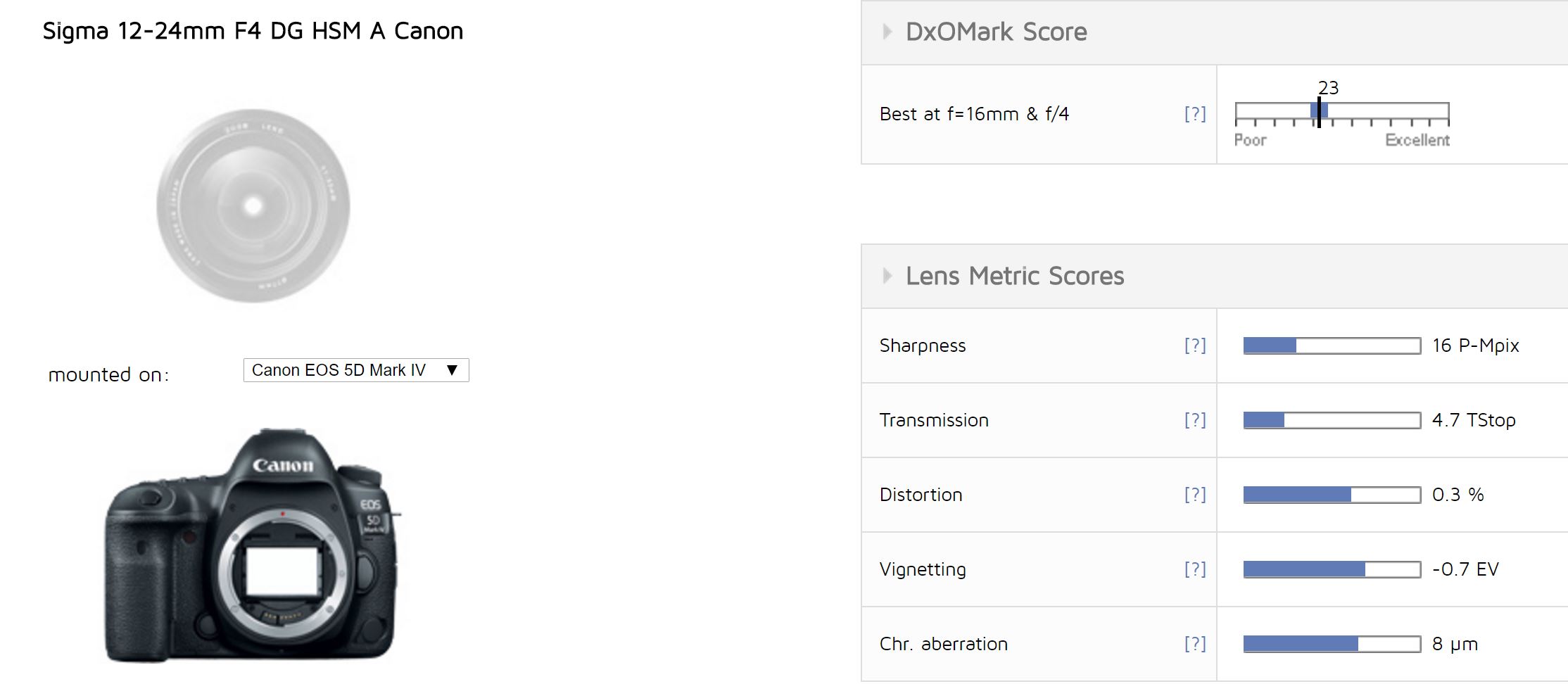 Sigma 12-24mm f/4 DG HSM Art lens test results shows very good sharpness with a score of 23 points. The optic tested on Canon EOS 5D Mark IV full-frame digital SLR camera.