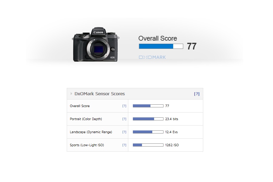 Canon EOS M5 sensor reviewed by DxOMark. They have posted the test results and the high-end APS-c camera achieved a score of 77 points overall.