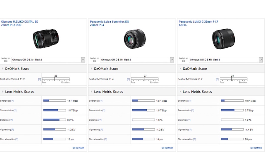 The Olympus 25mm f/1.2 boasts improved scores for sharpness and distortion compared to the Panasonic alternative. According to test results, the cons for the lens is expensive, noticeable chromatic aberration at wider apertures and lower resolution at f/1.2.