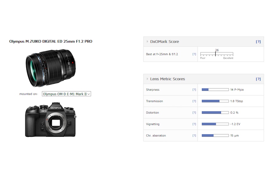 Olympus 25mm f/1.2 PRO lens test results published by DxOMark. The bright prime optic scored 26 points and becomes one of the highest-scoring MFT-mount lenses they’ve tested.