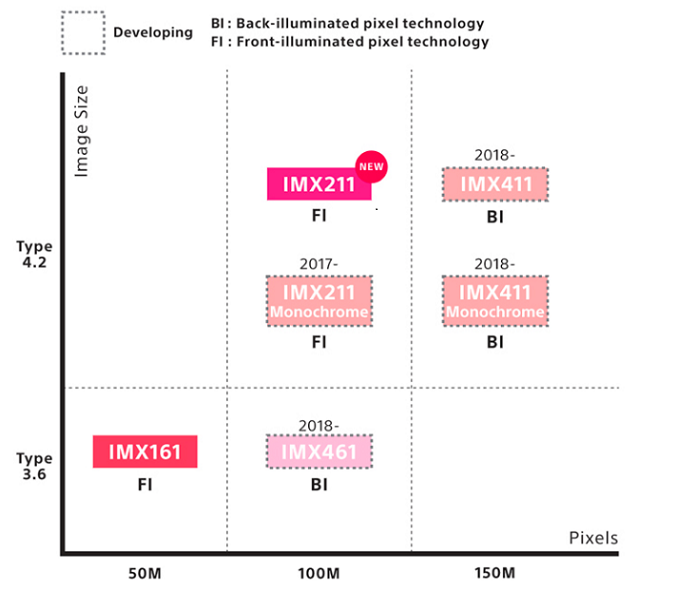The roadmap also includes a 150MP 55 x 41mm monochrome BSI sensor to be launched in 2018.