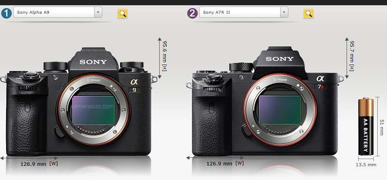 CameraSize has already add Sony Alpha a9 to their database. So let’s see the size comparison of Sony A9 vs Sony A7RII cameras. Both cameras are similar in body shape.