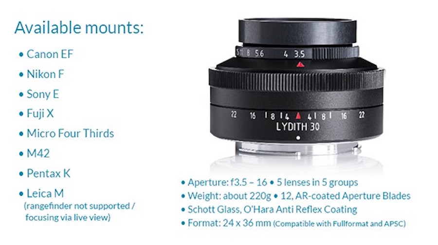 The Lydith 30mm f/3.5 is expected to ship in March 2018. The lens will be available in Canon, Fujifilm, Leica M, Leica SL, M42, Micro Four Thirds, Nikon and Sony mount. The standard price of this manual focus lens on the Kickstarter page is $749.
