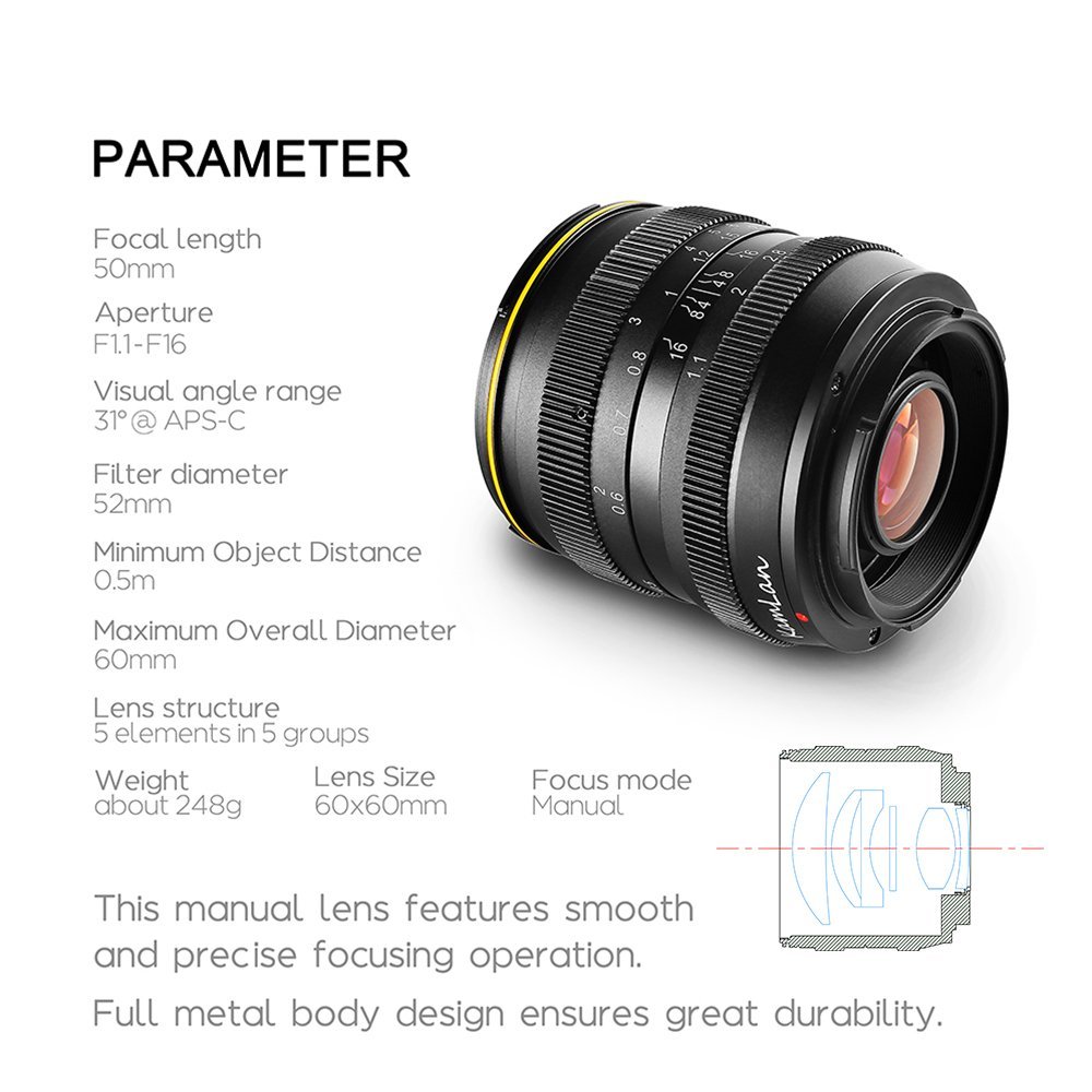 - Premium Optical Design – 11 circular aperture blade, 5 groups 5 elements lens stricture with high quality multi-coated optical glass, ensures low image distortion, excellent image sharpness and contrast. 50mm focal length is equivalent to 75mm on APS-C camera. Perfect for portraits shooting with fascinating background blur effect.