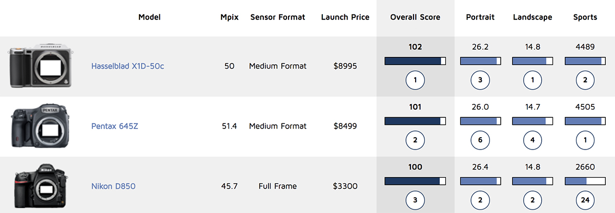 It’s interesting to compare the Pentax 645Z sensor against the Nikon D850’s because although the former is about 1.7x larger, it’s also around three years older. While the 645Z beats the Nikon sensor in our tests, the Nikon comes closer than you might expect, given the size difference. If Sony made a medium-format sensor with the same design as the D850, it would beat the sensors in both the Pentax 645Z and the Hassleblad X1D-50c.