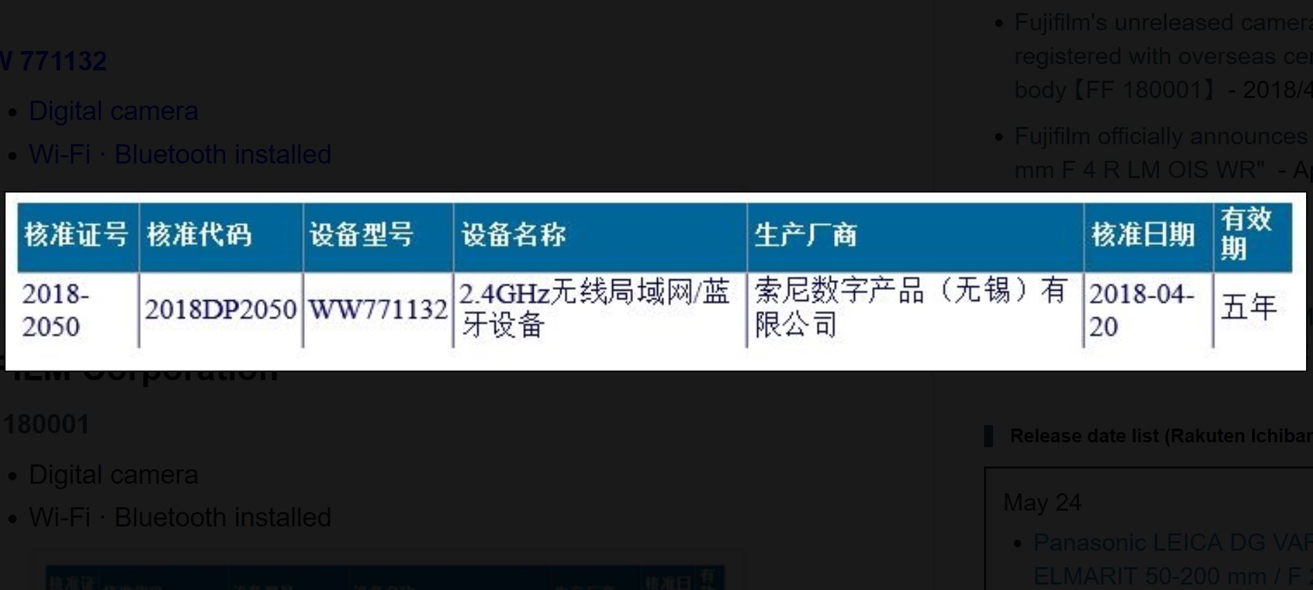 A new Sony “WW771132″ camera registered online. These kind of registrations are for Wi-Fi purposes and usually the official announcement will be at least in the next 2-3 months.
