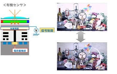 Organic sensors can change the sensitivity by controlling the voltage applied to the organic thin film. The electronic ND filter is capable of continuous step-by-step sensitivity setting, and the degree of freedom of photography is further improved.