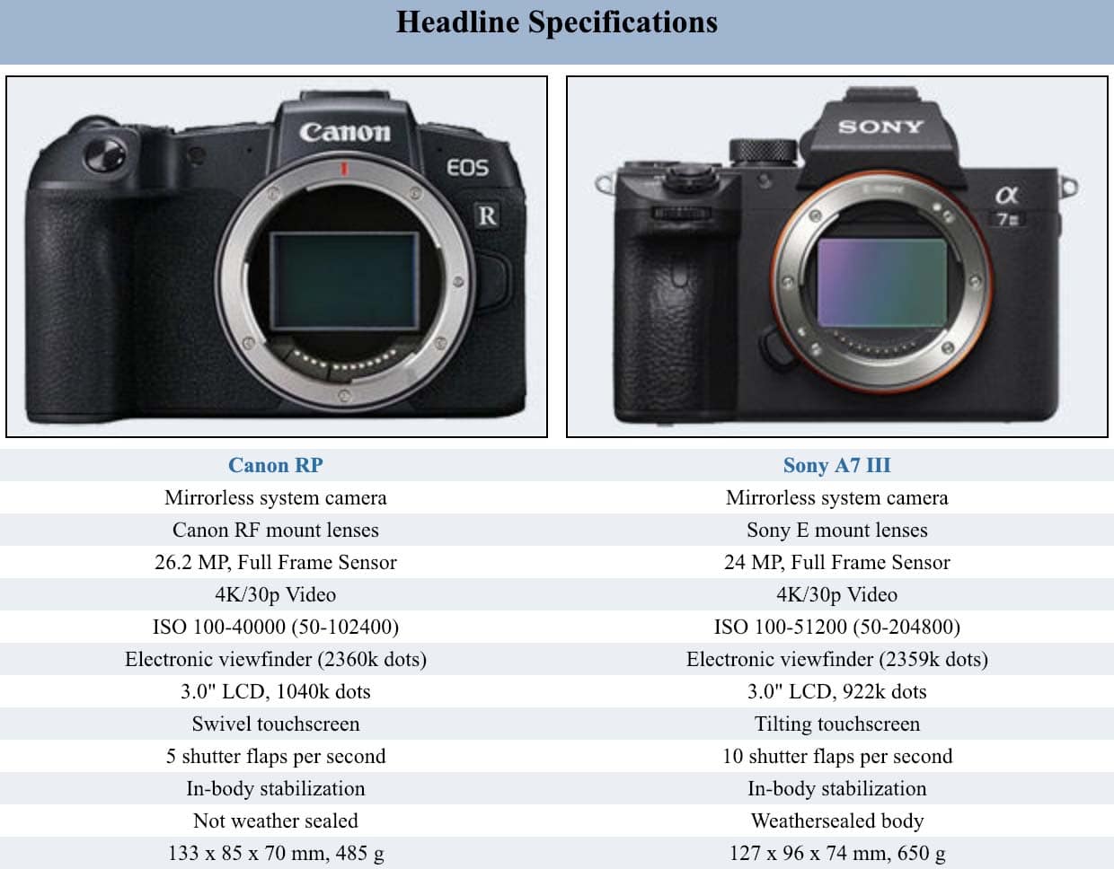 Here are the specs comparisons between the Canon EOS RP vs Nikon Z6 vs Canon R vs Sony a7 III cameras.
