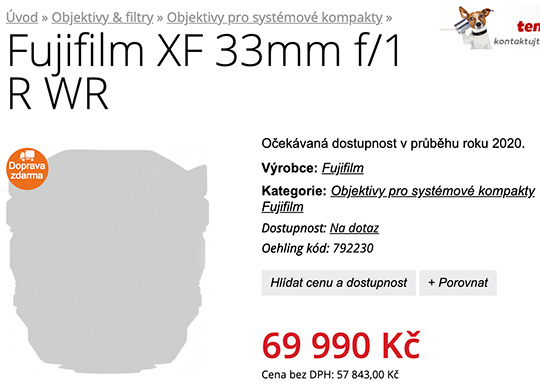Fujifilm XF 33mm f/1 R WR lens is listed at the Czech retailer Oehling. According to the cart the price of the XF 33mm f/1 R WR lens will be around $3,000.