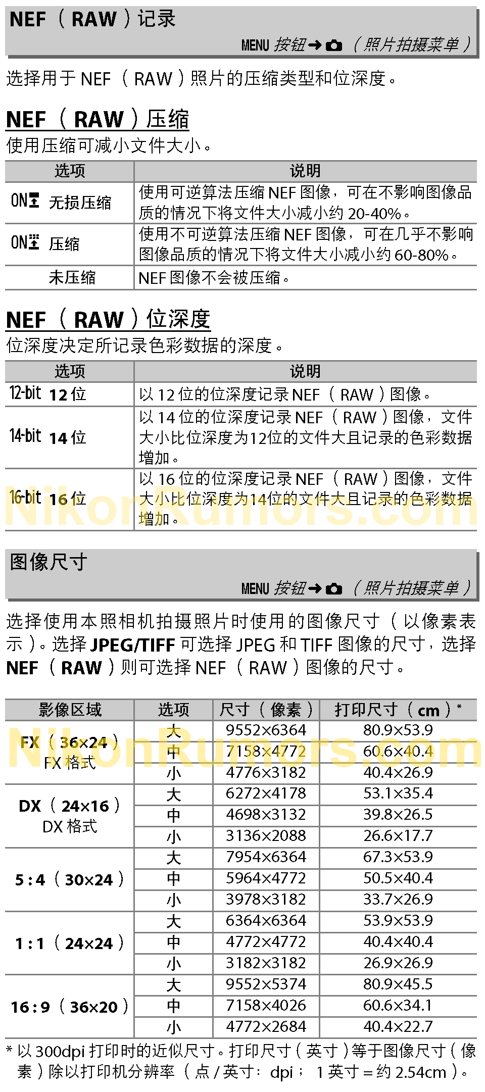 The manual page is identical to similar pages in the Nikon Z7 user’s manual. The main differences are the increase in resolution to 9552 x 6364 (just over 60MP total) and the addition of 16-bit NEF to the RAW section.